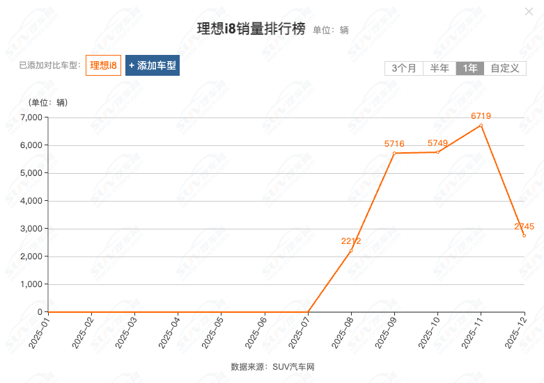 然而,因定价较高,以及乐道L90、问界M8纯电版、特斯拉Model YL等竞品层出不穷,理想i8的销量不及预期。汽车网数据显示,2025年8月-12月,理想i8的销量分别为2212辆、5716辆、5749辆、6719辆以及2745辆,合计仅2.31万辆。36氪汽车透露,目前理想i8每月新增订单仅千余个。